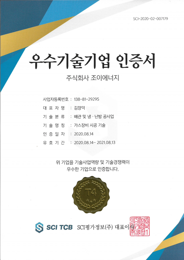 (주)조이에너지가 SCI TCB로부터 2020년 우수기술기업으로 선정되었습니다.